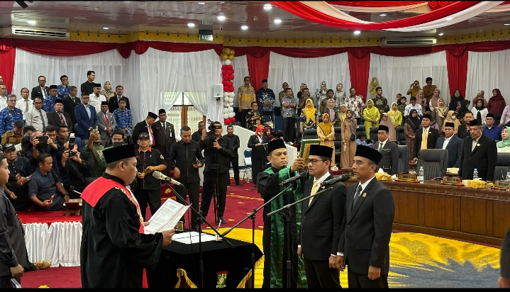 BANGKINANGKOTA(MagnificoNews.com) – Ketua Pengadilan Negeri Kelas IB Bangkinang Soni Nugraha memimpin dan memandu langsung pengucapan sumpah janji Pimpinan DPRD Kampar, Senin (28/10/2024) siang, bertempat di Ruang Sidang Paripurna, Lantai II, Gedung DPRD Kampar, Jalan Panglima Khotib, Kelurahan Langgini, Kecamatan Bangkinang Kota, Kabupaten Kampar.