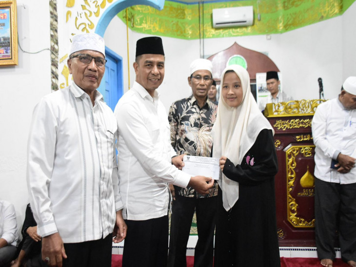 Sebelum menyampaikan sambutan, Bupati Kampar menyerahkan bantuan Program kemitraan PT. Bank Riau Kepri Syariah dan Pemerintah Kabupaten Kampar untuk Masjid Al-Falah sebesar Rp 20 juta, bantuan 100 Al-Qur’an dari ASN dan THL Pemkab Kampar, serta bantuan dari Baznas Kampar untuk kaum duafa.